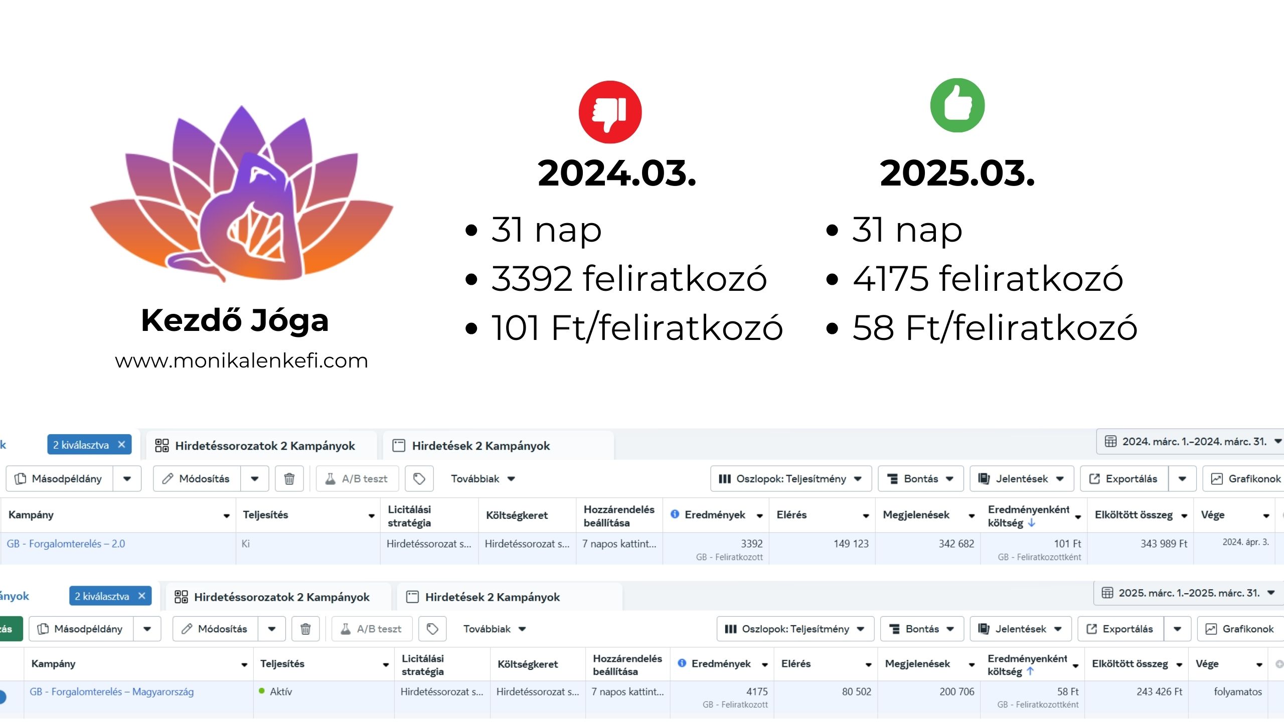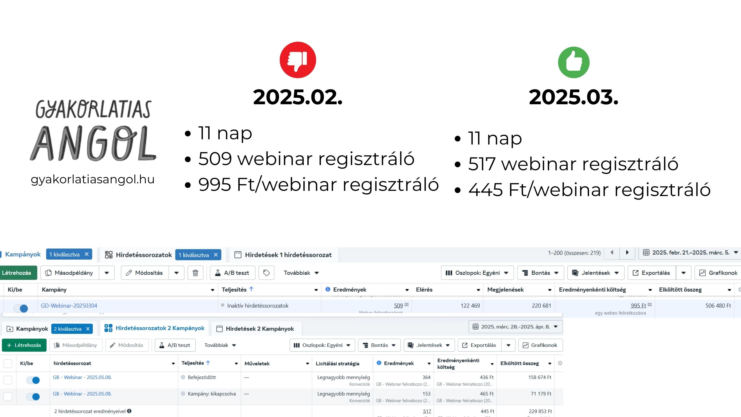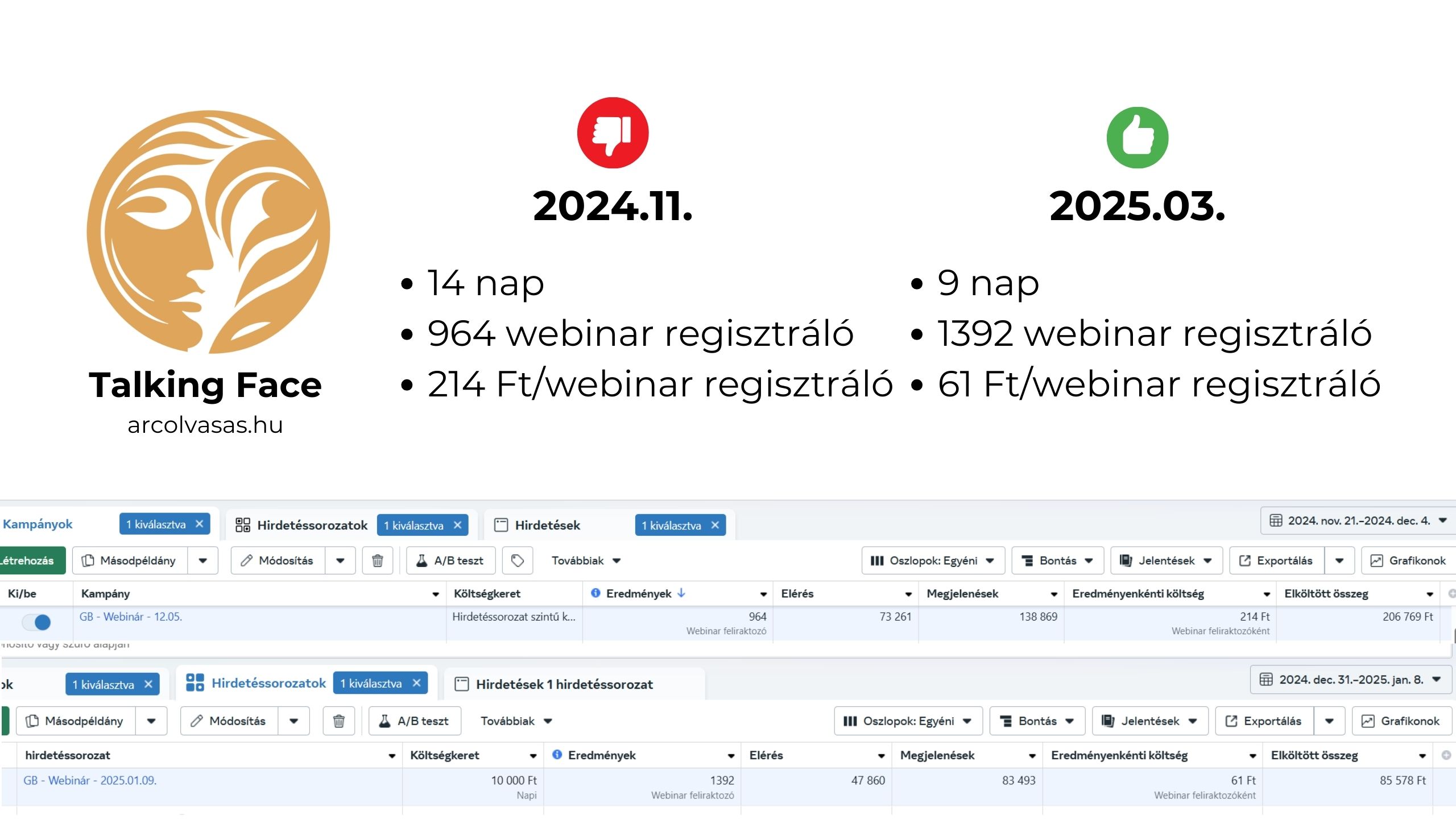 A költség piros színnel, a bevétel (konverzió) zöld színnel. És igen, ezek friss adatok, amiket neked is örömmel elérnénk!